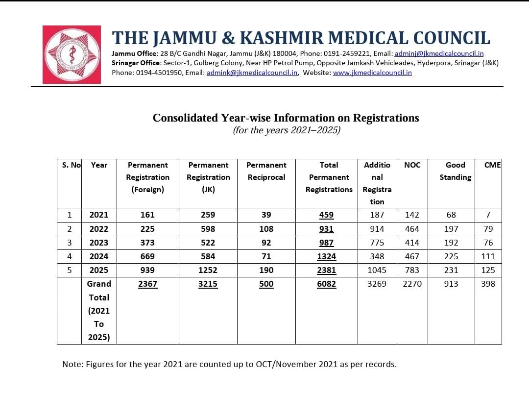 Srinagar/Jammu, Jan 16 — The Jammu and Kashmir Medical Council (JKMC) recorded a steep rise in medical registrations in 2025, processing 2,381 permanent registrations — an 80 per cent increase over 1,324 registrations in 2024, according to official data.