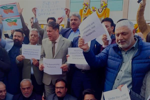Jammu, Feb 3 — Members of the ruling National Conference (NC) on Tuesday staged a dharna outside the Jammu and Kashmir Assembly, demanding restoration of statehood and action against the alleged harassment of Kashmiris in different parts of the country.