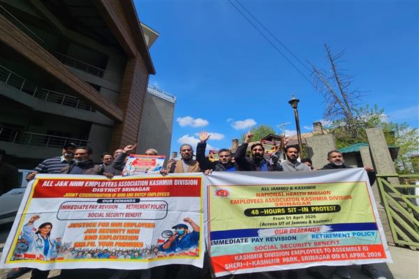 Srinagar, Apr 1 — Employees working under the National Health Mission (NHM) on Wednesday began a 48-hour sit-in at the Press Enclave here, pressing for long-pending demands including pay revision and job security.